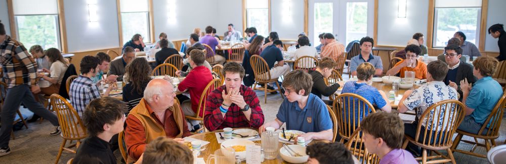 Lunch and dinner are served family style and students, under the leadership of the Dining Hall Prefects, work together to help set, serve, and clean up. The Administrator on Duty begins with a moment of reflection and thanks. One night per week, students wear jackets and ties to dinner.